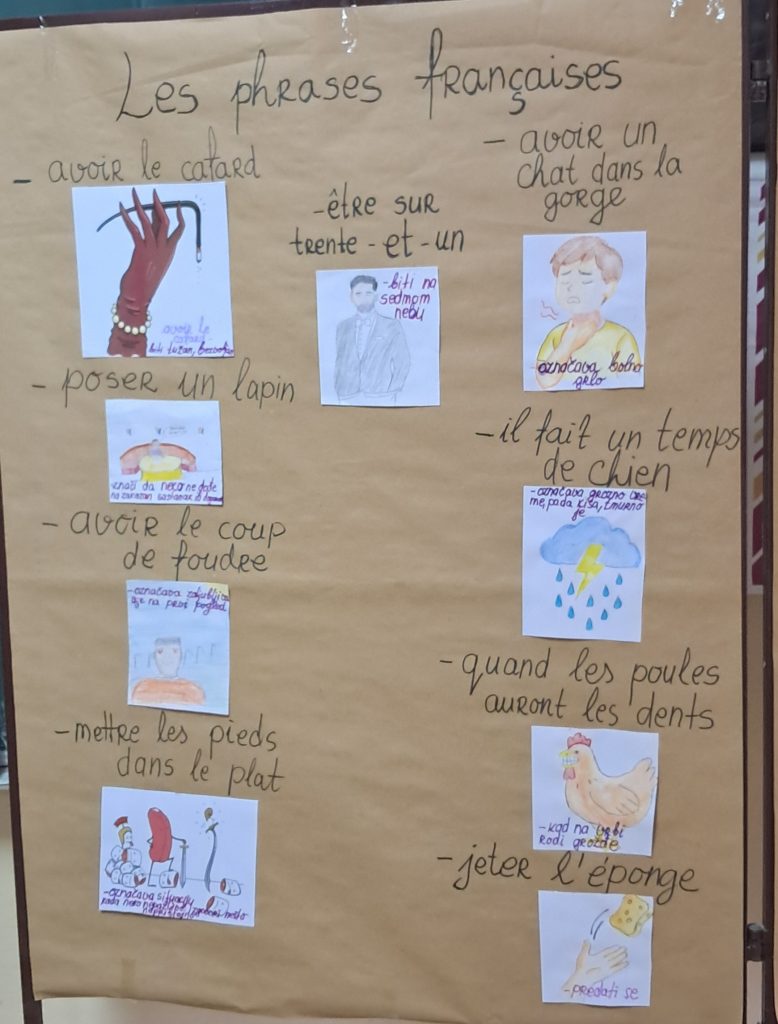 Радионица је почела уводним излагањем о фразеологизмима и њиховој употреби у свакодневној комуникацији. Ученици су затим радили три паноа: пано са фразеологизмима у француском, пано са фразеологизмима у енглеском и пано са фразеологизмима у српском језику. Након тога, са својим професорима разговарали су о сличним и различитим изразима у ова три језика. Ученици су активно учествовали и показали интересовање за радионицу. Уследио је квиз знања где су ученици објашњавали значења појединих израза.