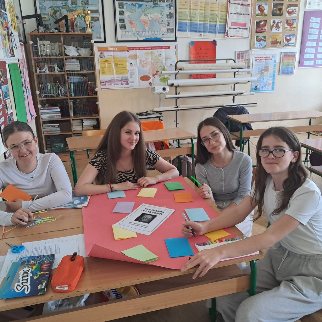 Током радионице ,,Драмски појмови“ ученици су се упознали са основним појмовима из области драмске уметности као што су протагонист, антагонист, дијалог, монолог, сцена и др. Кроз рад у групама , ученици су активно учествовали у изради паноа, на којем су представили научене појмове на креативан и прегледан начин. Посебан део радионице био је посвећен изради речника драмских појмова на српском и енглеском језику чиме су ученици повезали знања из српског и енглеског језика. Рад је протекао у позитивној и подстицајној атмосфери уз висок ниво ангажовања ученика. Радионица је успешно реализована 27. априла и допринела је бољем разумевању драмских појмова, као и развоју креативности и тимског рада. Координатори су били проф. енглеског језика Вера Јовашевић и проф. српског језика Дејан Славковић.